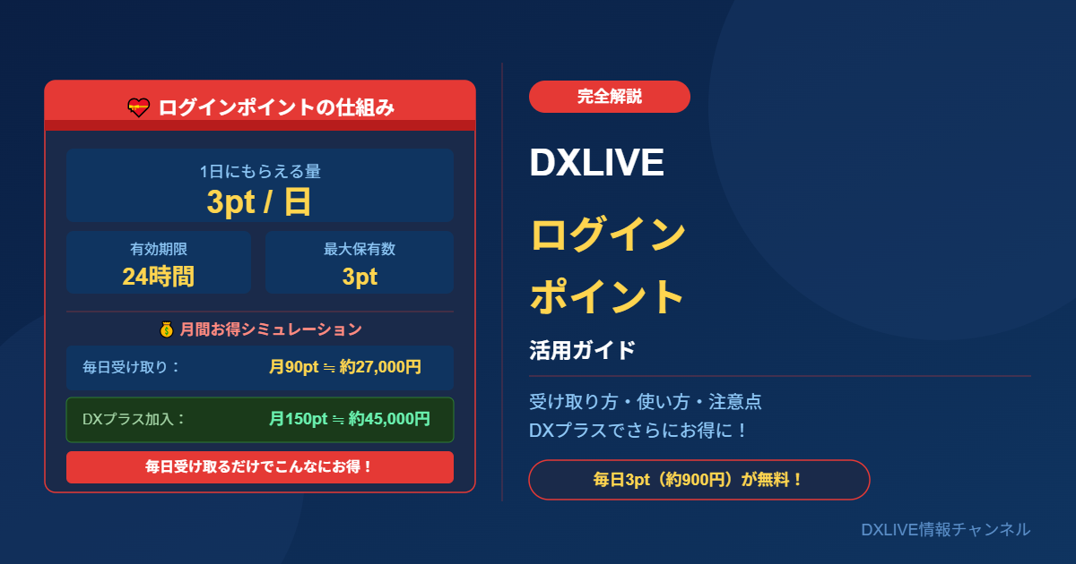 この記事ではDXLIVEの「ログインポイント」の仕組み・受け取り方・使い方・注意点を徹底解説します。毎日受け取るだけで月90pt(約27,000円相当)がお得になる超重要な機能です。