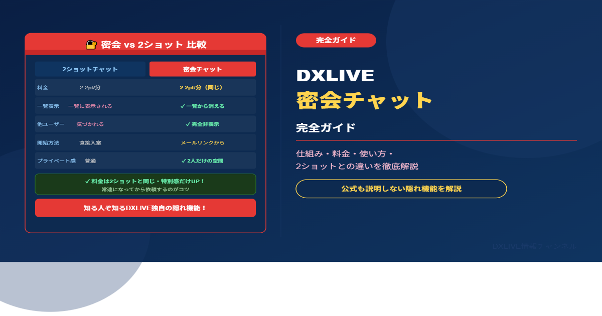 この記事ではDXLIVEの「密会チャット」の仕組み・2ショットとの違い・使い方の手順・料金・注意点をわかりやすく解説します。知る人ぞ知るDXLIVE独自の機能です。
