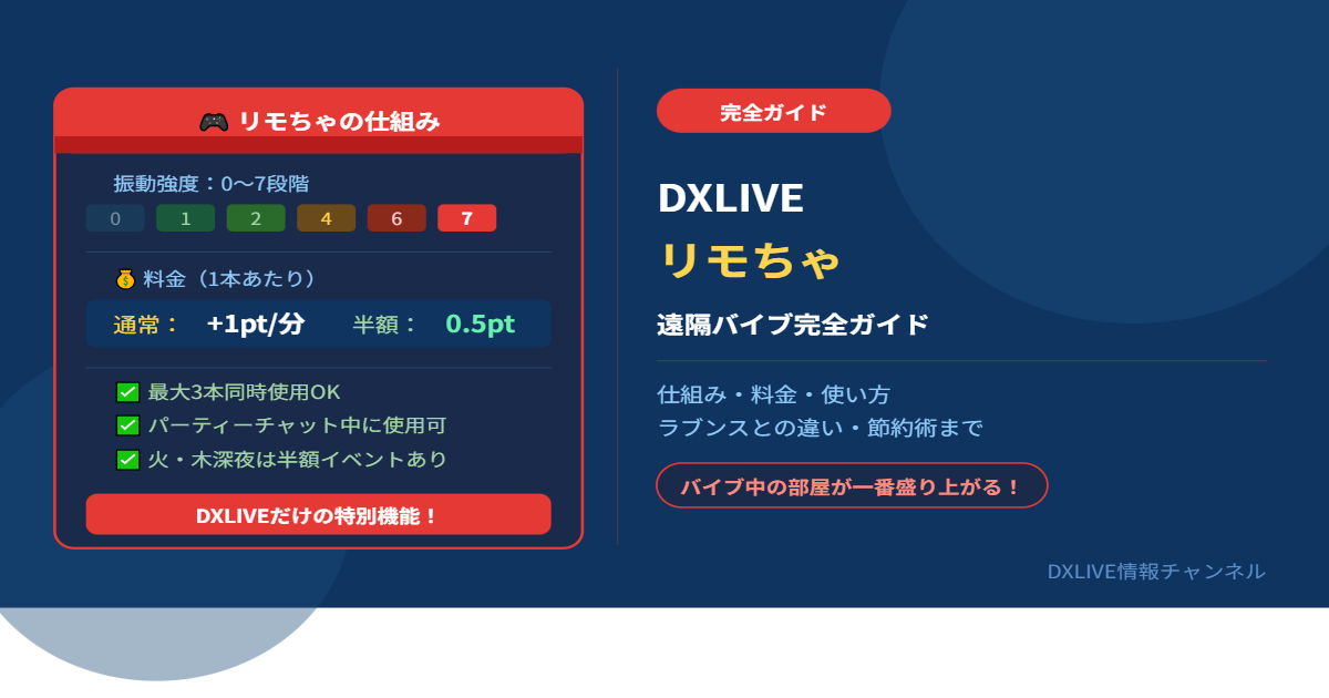 この記事ではDXLIVEの人気オプション機能「リモちゃ」の仕組み・料金・使い方・ラブンスとの違い・お得なイベント情報を詳しく解説します。リモちゃはDXLIVEならではの最大の魅力のひとつです。