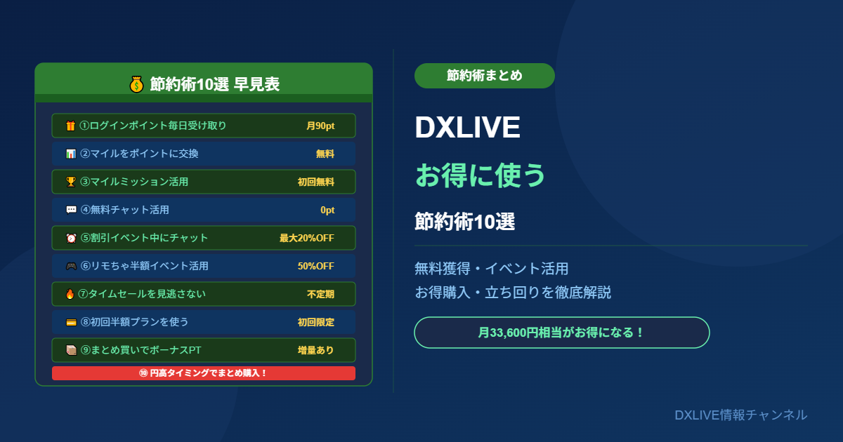 この記事ではDXLIVEをお得に楽しむための節約術を全10個まとめて解説します。無料でポイントを獲得する方法からイベント活用・購入タイミングまで、今日からすぐ使えるテクニックを紹介します。