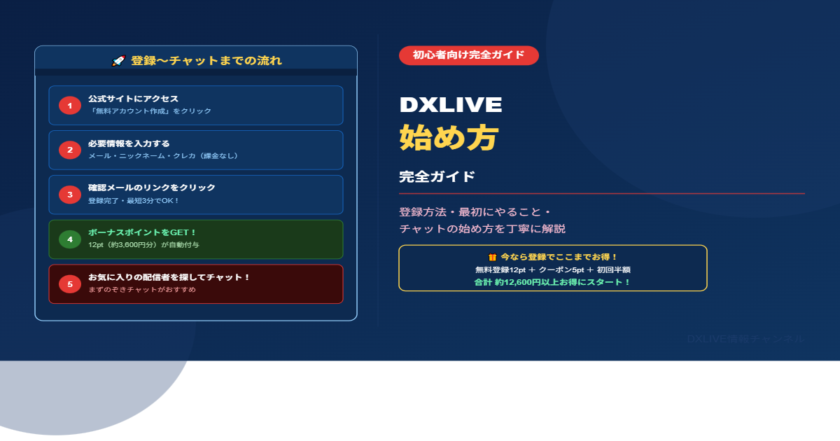 この記事では「DXLIVEを始めるための5ステップ」を初心者向けにシンプルにまとめました。登録〜初チャットまで最短30分でできます。各ステップの詳細は専門記事へのリンクも用意しています。