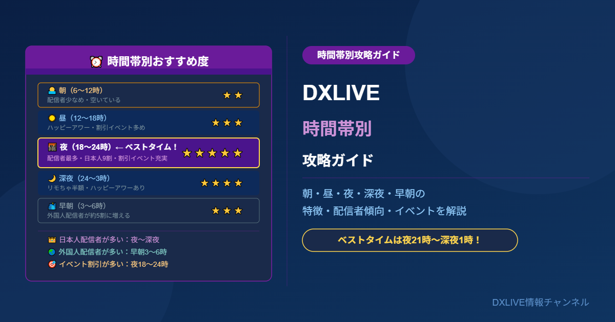 この記事ではDXLIVEの時間帯ごとの特徴・配信者の傾向・おすすめの楽しみ方を徹底解説します。時間帯を理解することでポイントを無駄なく使えるようになります。