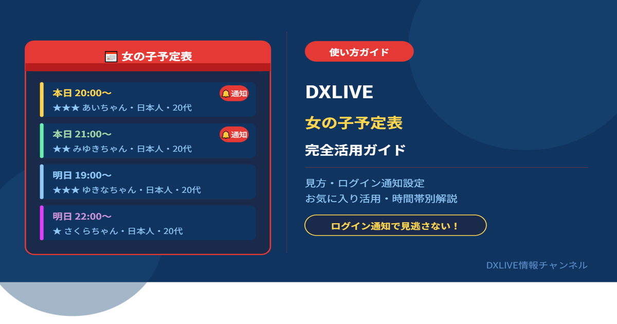 この記事ではDXLIVEの「女の子予定表」の見方・使い方・活用法を詳しく解説します。予定表を使いこなせば好きな配信者がオンラインになるタイミングを逃さずに楽しめます。